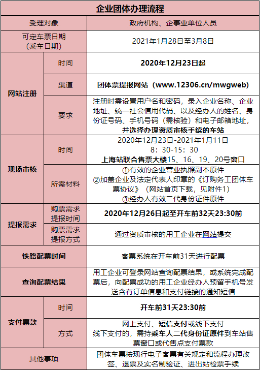 2020年12月23日起,用工企业可登陆团体车票办理网站(www.12306.cn/mwgweb,以下简称网站)注册账户,录入企业信息。