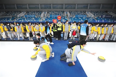 昨天下午,完成第二次“水冰转换”的国家游泳中心“冰立方”,迎来了首批前来体验冰壶项目的观众。场地内4条标准赛道被一分为二,来自北京市二中分校的约800名学生,分批进入场地,在工作人员的指导下,有序体验冰壶投放。赛道旁站满了围观的同学,不时传出欢呼声。