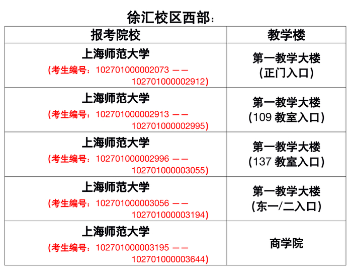准考证上考试地点为上海师范大学西部第一教学大楼、商学院的考生,请从我校徐汇校区西部大门(桂林路100号)进入;