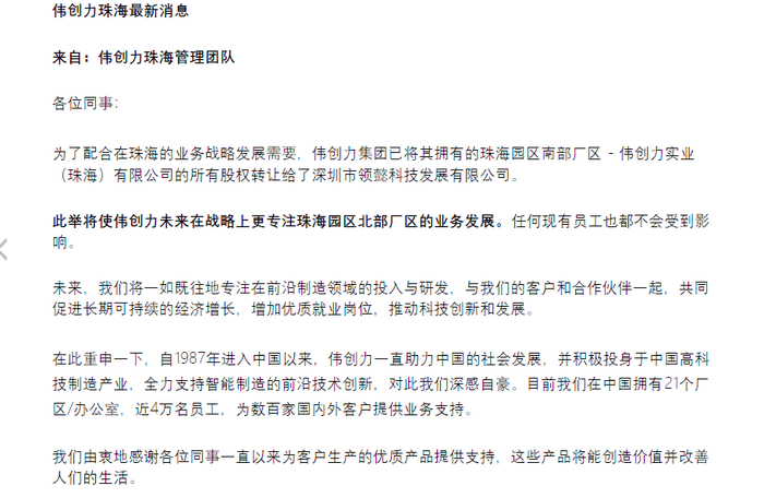 12月23日,贴吧上还流传出一则伟创力珠海管理团队的内部发文。该发文称,为了配合在珠海的业务战略发展需求,伟创力集团已经将其拥有的海珠园区南部厂区——伟创力实业(珠海)有限公司所有股权转让给深圳市领懿科技发展有限公司,此举将使伟创力未来在战略上更专注珠海园区北部厂区的业务发展。任何现有员工都不会受到影响。