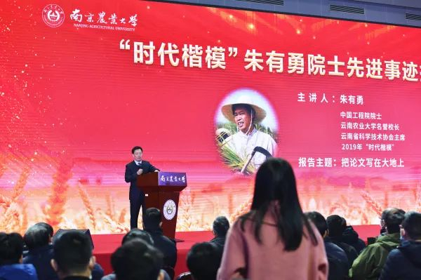 12月24日,“时代楷模”朱有勇院士来南京农业大学作题为“把论文写在大地上”的主题报告。南农千余名师生代表共同聆听“农民院士”思政课。