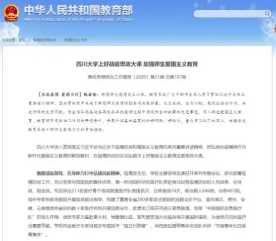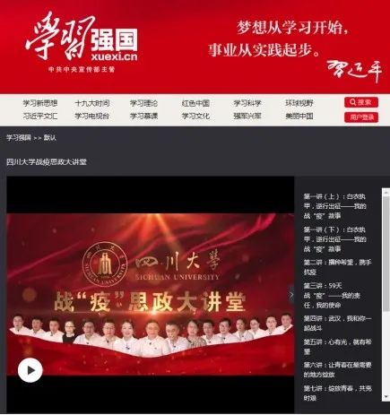 大力弘扬伟大抗疫精神,化“疫情危机”为“思政契机”。《四川大学战疫思政大讲堂》12集系列专题片在“学习强国”专题展播,《战疫到底,川大同行》专题片获全国教育系统微视频征集活动第1名。
