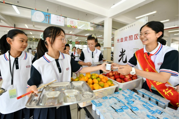 浙江省湖州市长兴县实验中学在小份制售餐、分餐自主选择的基础上,推出食堂就餐“光盘换牛奶”激励机制,全体师生凭借“光盘”免费换取水果或牛奶,自觉养成“光盘”习惯,共同抵制“舌尖上的浪费”。图为在长兴县实验中学光盘奖励区,学生们凭借“光盘”换取牛奶或水果。(图片来源:视觉中国)