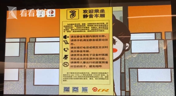 上午,看看新闻Knews记者搭乘试点“静音车厢”的G2次列车从虹桥站出发前往南京。这趟复兴号列车的3号车厢,也就是“静音车厢”两端及车厢端门玻璃内外两侧张贴了“静音车厢”标识,“静音车厢”座位网兜后摆放了“服务提示卡”告知旅客相关注意事项。