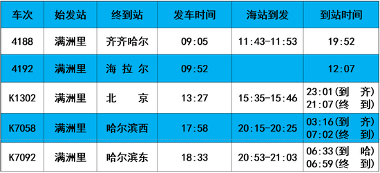 2020年12月25日起满洲里站恢复齐齐哈尔——满洲里的4187次列车终到,12月26日满洲里站恢复满洲里——齐齐哈尔的4188次列车始发。