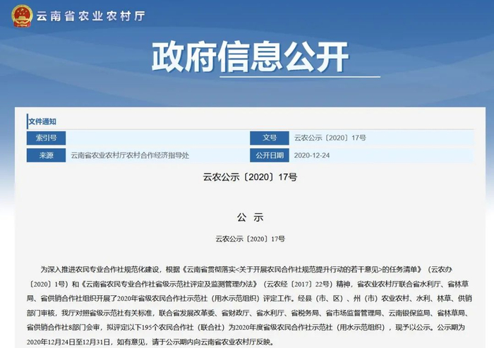 为深入推进农民专业合作社规范化建设,根据《云南省贯彻落实<关于开展农民合作社规范提升行动的若干意见>的任务清单》(云农办〔2020〕1号)和《云南省农民专业合作社省级示范社评定及监测管理办法》(云农经〔2017〕22号)精神,省农业农村厅联合省水利厅、省林草局、省供销合作社组织开展了2020年省级农民合作社示范社(用水示范组织)评定工作。经县(市、区)、州(市)农业农村、水利、林草、供销部门审核,我厅对照省级示范社有关标准,联合省发展改革委、省财政厅、省水利厅、省税务局、省市场监督管理局、云南银保监局、省林草局、省供销合作社8部门会审,拟评定以下195个农民合作社(联合社)为2020年度省级农民合作社示范社(用水示范组织),现予以公示。公示期为2020年12月24日至12月31日,如有意见,请于公示期内向云南省农业农村厅反映。