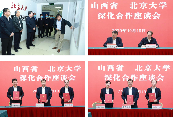 10月19日,山西省委书记、省人大常委会主任楼阳生率领山西省党政代表团访问北京大学。会上签署了三大协议对山西大学乃至山西省将产生深远影响。根据《山西省人民政府与北京大学科技创新战略合作协议》,山西省人民政府与北大将依托彭练矛院士团队共建北京大学山西碳基薄膜电子研究院,研究院设在山西大学,以政产学研用相结合的模式着力建设国内一流的技术创新平台和成果转化基地。《北京大学-山西大学-大地固废资源循环利用协同研究中心及煤基固废资源循环利用重点实验室共建协议》,将依托北大城市固体废弃物资源化技术与管理实验室进行深度合作。《北京大学-山西大学-大同市人民政府共同推进云冈学建设战略合作协议》,三方将发挥各自优势对云冈学进行深度研究。