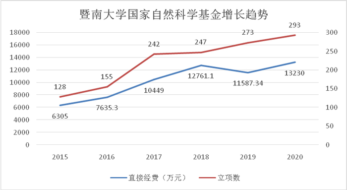 截至12月17日,暨南大学共获资助国家自然科学基金293项,其中集中受理期项目287项,立项数较去年同期增长20项,获批直接经费1.323亿元,立项数和资助经费数均创历史新高。