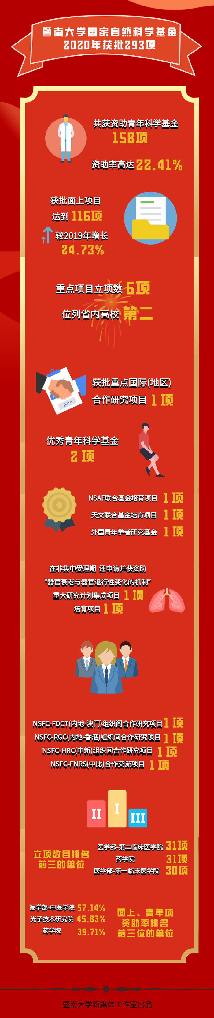 从项目类型来看,暨大共获资助青年科学基金158项,资助率高达22.41%;获批面上项目首次突破100项,达到116项,较2019年增长24.73%;重点项目立项数创历史新高,达到6项,是过去两年的总和,立项数位列省内高校第2;获批重点国际(地区)合作研究项目1项、优秀青年科学基金2项、NSAF联合基金培育项目1项、天文联合基金培育项目1项、外国青年学者研究基金1项。