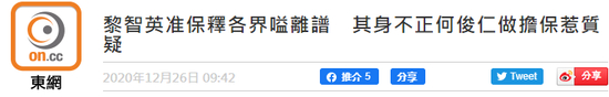 [环球网报道 记者 尹艳辉]乱港头目、“壹传媒”创办人黎智英23日获准保释,黎智英的保释条件包括现金1000万港元,另需3名人事担保各10万港元。香港“东网”12月26日报道称,有人表示3名担保人与黎智英关系千丝万缕,其中以民主党前主席何俊仁与黎智英最同声同气,何俊仁早前也曾因涉组织及参与未经批准游行被捕,质疑何俊仁作为担保人的资格,认为黎智英应继续被羁押。