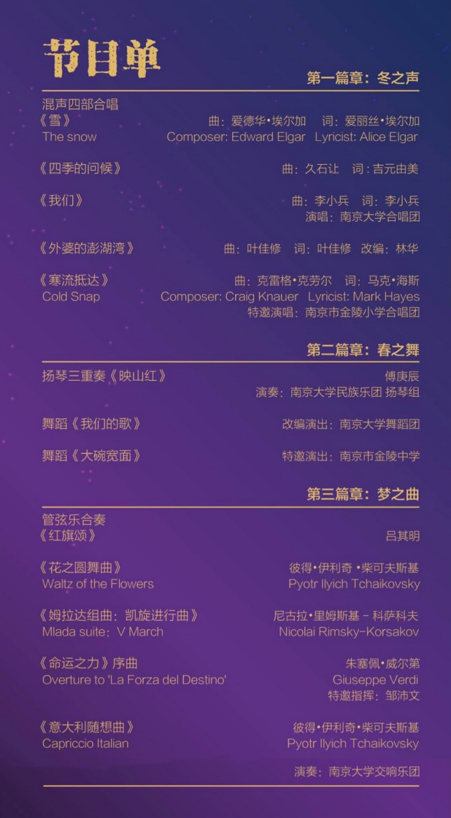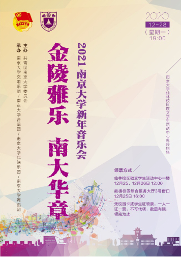 承办方:南京大学交响乐团、南京大学合唱团、南京大学民族乐团、南京大学舞蹈团