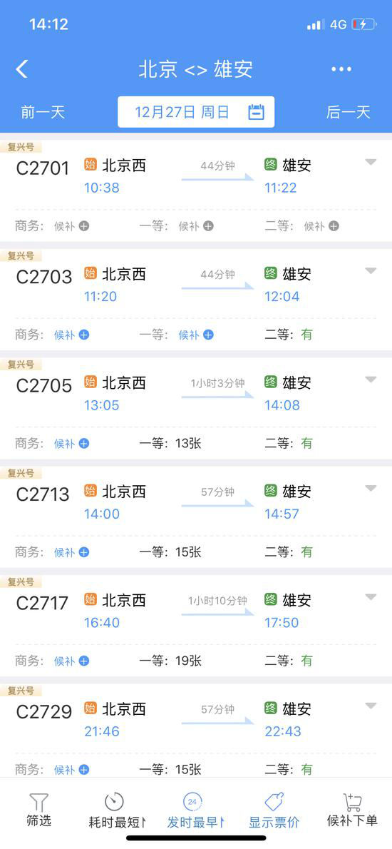 记者今日中午查询12306网站发现,明日雄安开往北京西站共有6趟列车,最早一趟是10时18分,从雄安一站直达北京西站。目前这趟首发列车车票已经卖完,需要候补抢票。当日最晚一趟车是19时49分从雄安发车,终到北京西站,经停霸州北站、大兴机场站。