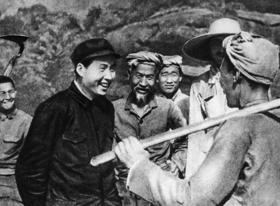 卡尔曼认为,这鲜明地展示了共产党领袖与人民的亲密关系。“农民们把毛泽东围得越来越紧。他们当中有一个老头,皮肤呈古铜色,皱纹很多,高颧骨,上嘴唇和下巴上长着稀疏的灰白小胡子,他像中国北方几乎所有农民一样,脑袋上裹着灰色的缠头。其他人较年轻一些。所有人手里都拿着铁锹、铁铲。他们穿着褪了色、打着补丁的土布衬衫。大家都聚精会神地交谈着,经常爆发出阵阵笑声。要知道,毛泽东非常爱开玩笑,他肯定会在谈到最严肃事情时,插上几句俏皮话。”
