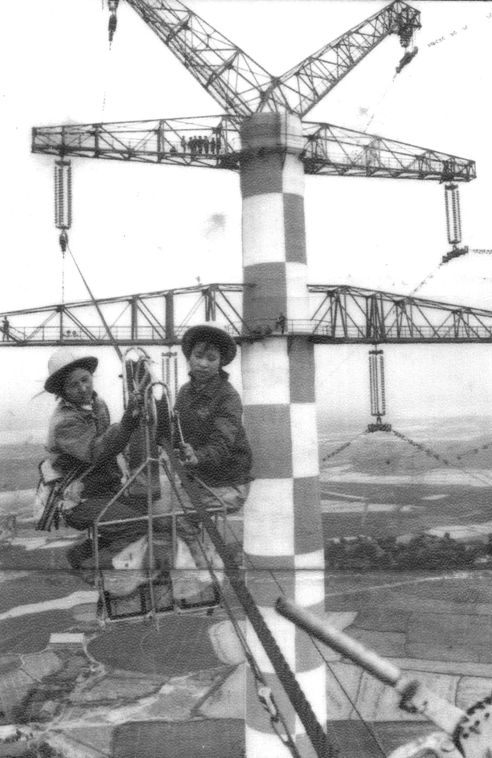1973年《中国建设》上刊登的那张照片,是“三八”带电作业班班长程亚林与班员郝明菁(右)在武汉市武昌石嘴—汉阳沌口220千伏跨江线塔上,在离地146米的高空带电更换绝缘子的工作照。