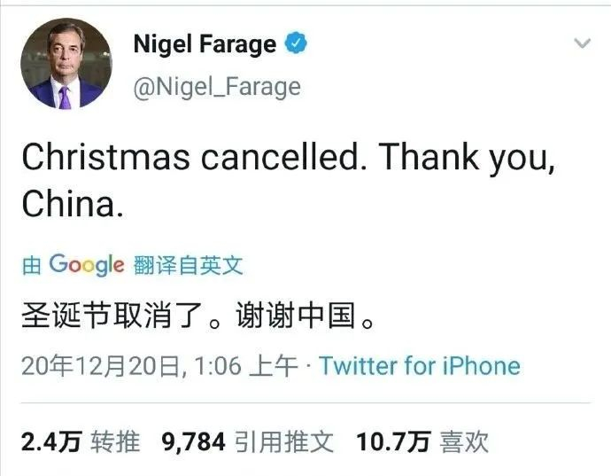 在英国政府宣布封城措施后,“脱欧党”领袖法拉奇发推:“圣诞节被取消了,谢谢你中国”,话里的意思不言而喻。