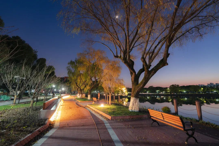 因思源湖的硬质驳岸距水面有一定距离,湖边夜间照明在树木的遮挡下也比较昏暗,故夜间的安全性较低。这次改造通过平台栏杆、岸边绿化两种不同形式的交织,在保证观赏视线的开阔与通透的同时,默默地守护着大家的安全。