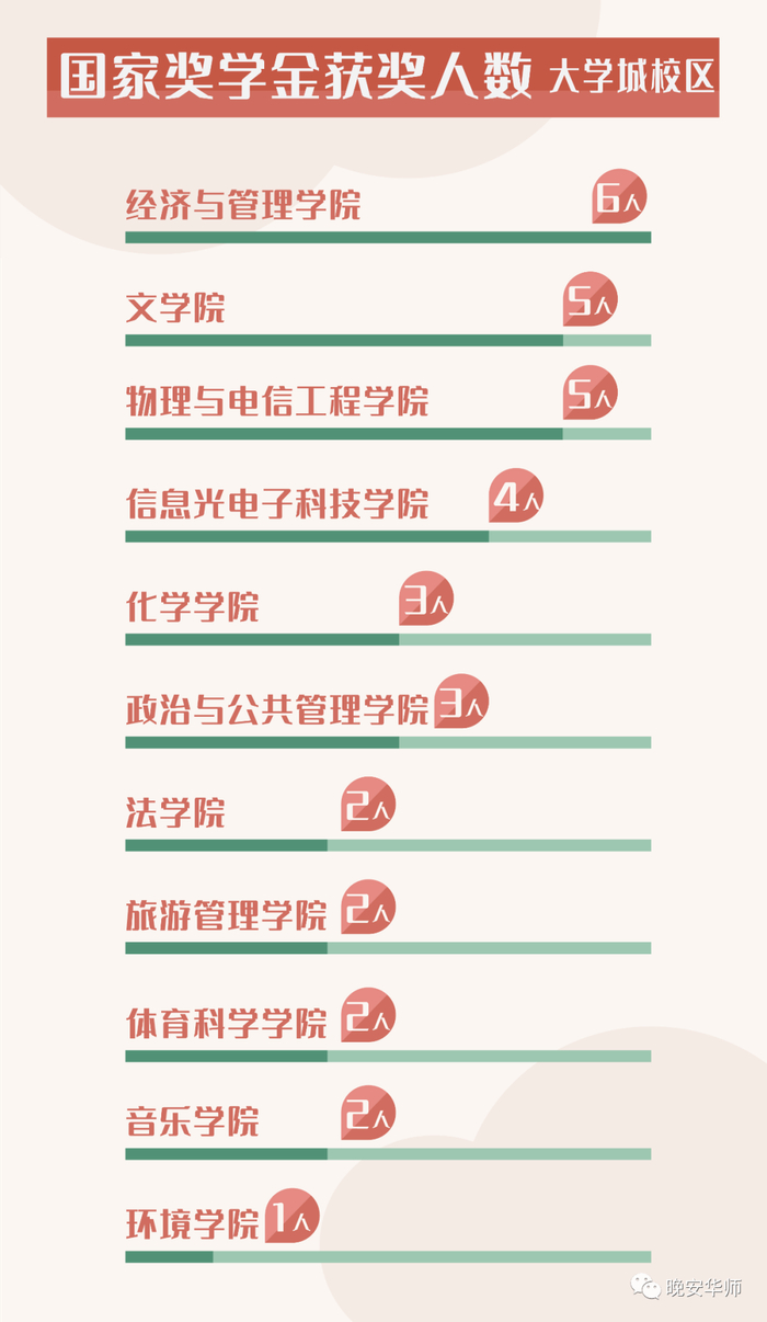 据了解,本次国家奖学金评选名额,采取“候补人选替换制”,学院按照“计划名额+候补名额”的方式推荐候选人。名额分配按学院学生人数比例、适当倾斜师范生两个原则确立。从获奖人数上看,经济与管理学院获奖人数最多,为六人;文学院、物理与电信工程学院有五人;外国语言文化学院、数学科学学院、信息光电子科技学院各有四人;其他各学院名额则为一到三人。