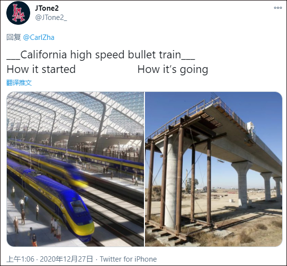 一名网民还截了几张不同时间的新闻报道,痛诉美国加利福尼亚州高铁建设缓慢:加州高铁建设将花费1000亿美元和20年(2011年);高铁建设出问题了,预计将花费更多经费和时间(2018年);高铁从加州创新顶峰沦为地狱般的项目、高铁项目如何偏离轨道的(2019年2月)。