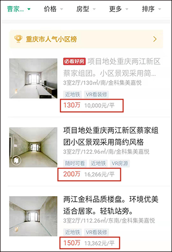 优质的教育和商圈资源,最先带高的当然是房价。一款房屋交易软件上的信息显示,曹家湾地段的房屋均价已逼近每平15000元,这一价格直接超过重庆九龙坡、大渡口等众多核心主城区域的房价。