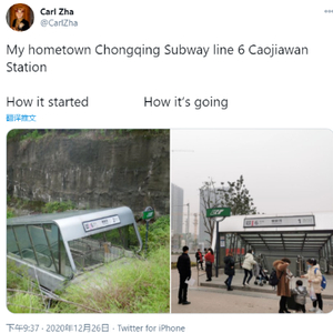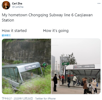 12月26日,活跃在社交媒体上的华裔网民Carl Zha在推特发了几张对比照片,配文:我家乡重庆地铁6号线曹家湾站,2017(开端)VS 2020(如今)。