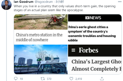 对上述部分外媒将中国基建“规划前置”抹黑为“鬼城”的做法,一名外国网民27日的评价一针见血:“当你生活在一个只看重短期收益的国家,一个实际计划的开始阶段看起来就会像是世界末日。”