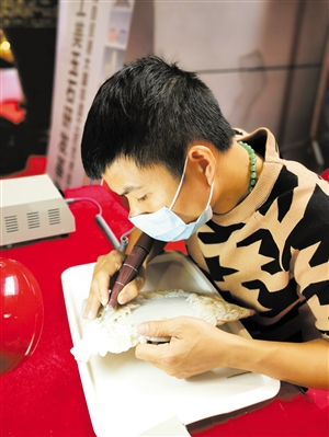 ③海南工艺匠人在活动现场认真雕刻作品。