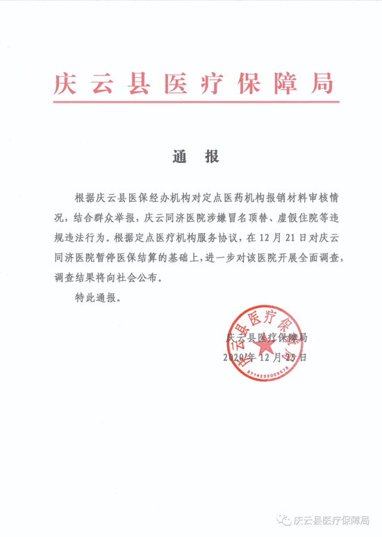 根据定点医疗机构服务协议,在12月21日对庆云同济医院暂停医保结算的基础上,进一步对该医院开展全面调查,调查结果将向社会公布。