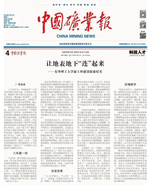 来源:东华理工大学编者按:近年来,我校相继获批全国首批“新工科”研究与实践项目和全国首个旅游地学与规划工程新工科专业,学校新工科建设轰轰烈烈展开,三维地质调查与建模技术作为又一新工科方向正在实践探索之中。中国教育报、科技日报、中国核工业报、中国矿业报等主流媒体对此进行报道,引发社会广泛关注。现将全文转载如下: