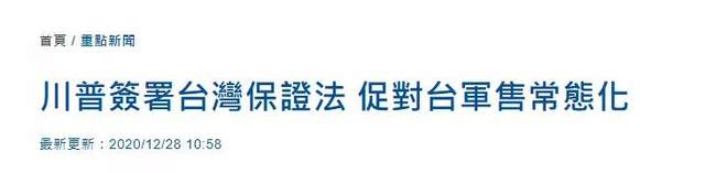 台媒28日报道,美国总统特朗普当地时间27日正式签署2.3万亿美元新冠纾困法案和政府拨款法案,其中包含所谓“台湾保证法”,不仅试图促进美国政府对台军售常态化,还要支持台湾参与联合国等国际组织活动,同时准备更新“美对台交往准则”。