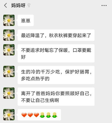 “离开了爸爸妈妈也要好好地戴上口罩,秋衣秋裤穿起来,生的冷的千万要少吃,保护好肠胃,不要让自己生病啊。”