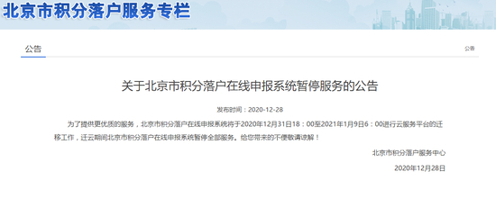 原标题:北京市积分落户在线申报系统31日18时起暂停服务