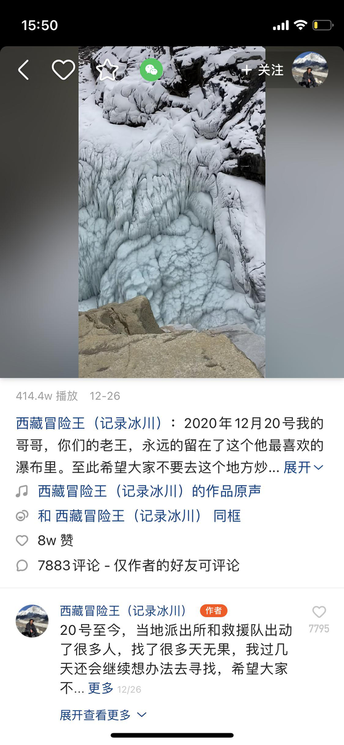 12月26日,王相军弟弟用王相军快手账号“西藏冒险王(记录冰川)”发布视频称,“2020年12月20日,我的哥哥,你们的老王,永远地留在了这个他最喜欢的瀑布里。”视频内容为那曲嘉黎县一处冰川的瀑布。