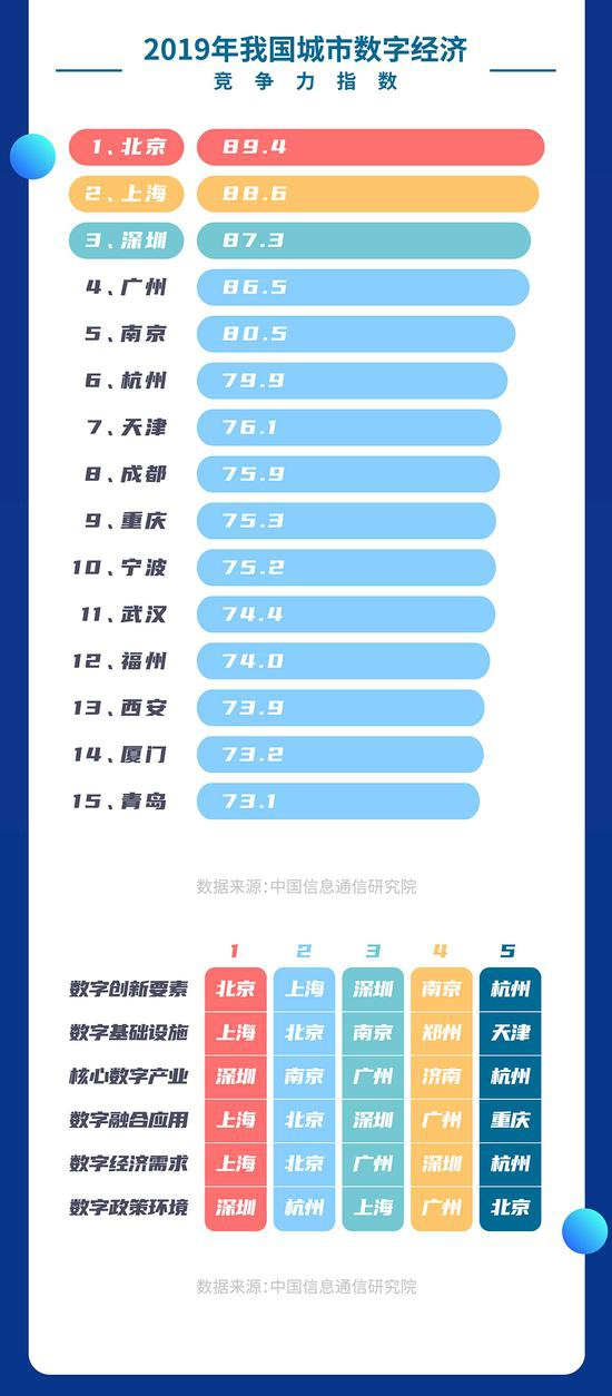 从城市整体来看,2019年数字经济竞争力指数排名前十五位的城市分别为北京、上海、深圳、广州、南京、杭州、天津、成都、重庆、宁波、武汉、福州、西安、厦门、青岛。