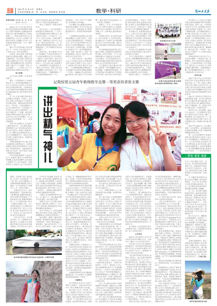 回忆起省赛现场,张文雅笑了起来,说道:“那天是巅峰状态,讲得自己特别高兴。”按照规定,每位老师应该讲二十分钟左右,误差不超过一分钟。张文雅讲到最后一句话,“我们下节课再见”,语音刚落,铃声响起。