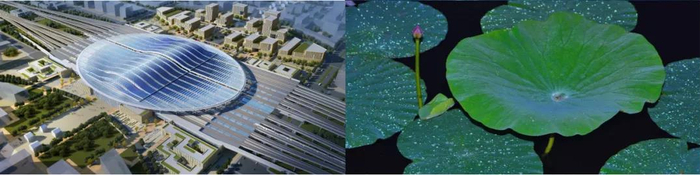 引领发展的规划理念。雄安站椭圆形屋盖形如清泉源头,温润圆满,中间结合高架候车厅自然隆起,形成三重梯度变化。椭圆形屋顶上的材质由通透的阳光板渐变为深蓝色的光伏板,如粼粼波光,晶莹闪亮,在蓝绿交织的城市组团中又似荷叶上的露珠,是依托高铁而生的新兴城市的组团之心,也是蓝绿交融的景观廊道上的生态之心。在建设伊始,站房实施方案的迅速确定,极大地推进和稳定了枢纽片区、枢纽核心区、昝岗高铁片区的规划设计,使车站建设引领城市发展的最初规划构想得以实现。