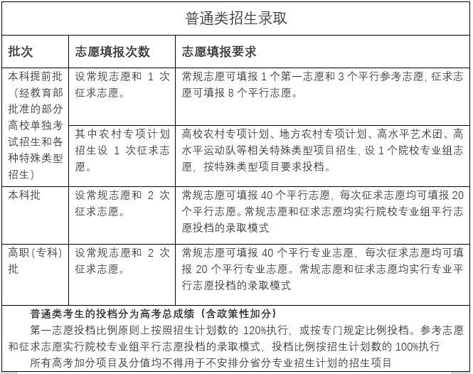 分为本科提前批、本科批和高职(专科)批三个录取批次,录取工作按三个批次依次进行。按照普通类本科、专科招生计划数的适当比例划定普通类本科录取控制线、专科录取控制线和特殊类型录取参考线。