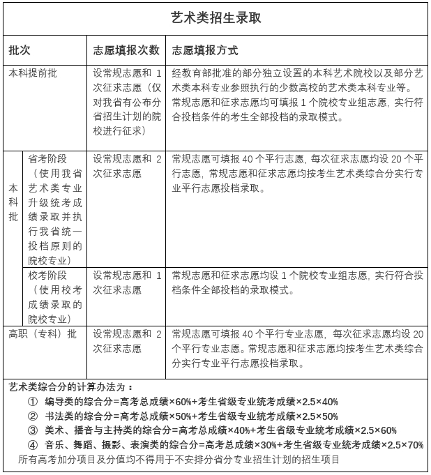 分为本科提前批、本科批和高职(专科)批3个批次,按照普通类本科、专科录取控制线和艺术类专业统考满分成绩的适当比例划定艺术类本科、专科文化考试成绩录取控制线和专业录取控制线。
