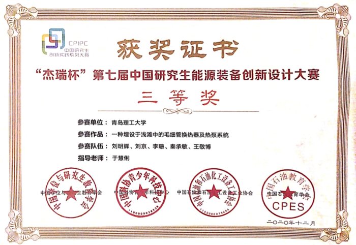 12月4-6日,“杰瑞杯”第七届中国研究生能源装备创新设计大赛全国总决赛在西安石油大学举行。由我校环境与市政工程学院于慧俐老师指导,刘明辉、刘京、李珊、王敬博和秦承敏五位研究生完成的作品《一种埋设于浅滩中的毛细管换热器及热泵系统》在此次大赛中荣获三等奖。这也是我校环境与市政工程学院研究生首次在该项赛事中取得奖项。