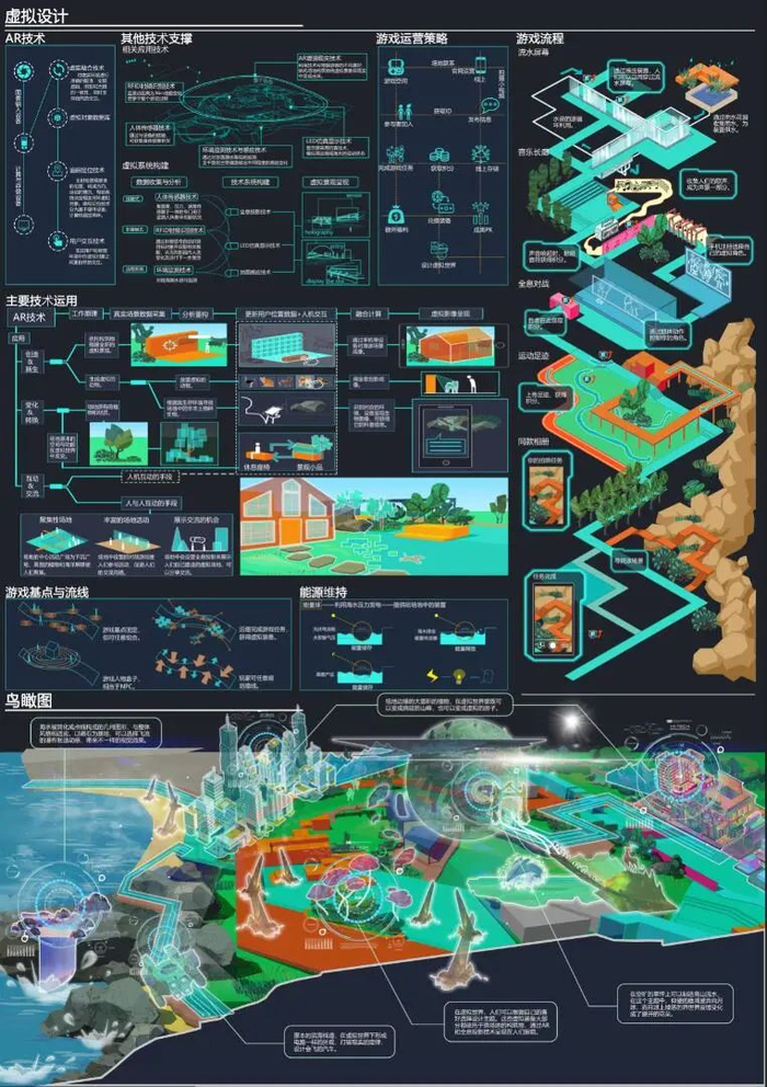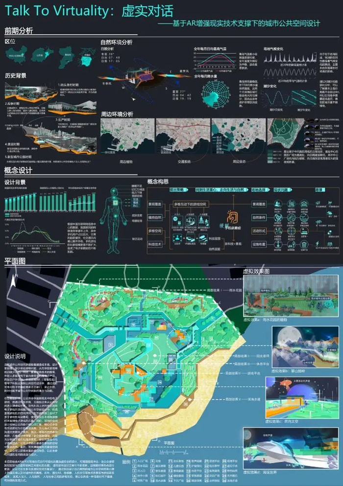 《Talk to virtuality》作品选址青岛市燕儿岛公园。当代城市公共空间多面临着建造成本高、设计更新慢、缺少体验感等问题,从而导致使用率低且缺乏活力。同时,随着信息技术的提高,年轻人多倾向宅于室内使用手机等电子产品,缺乏户外活动。获奖方案将AR(增强现实)等科技手段运用到城市设计中,通过此方式吸引“电子依赖症”患者走出家门、亲近自然,同时赋予城市公共空间新的理念与功能。