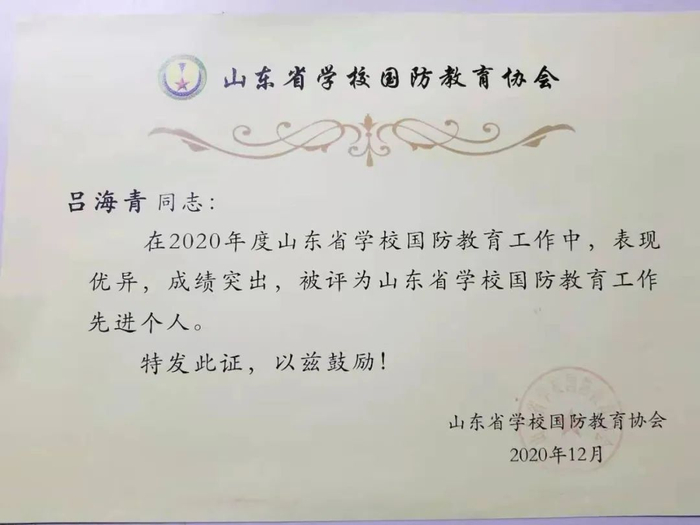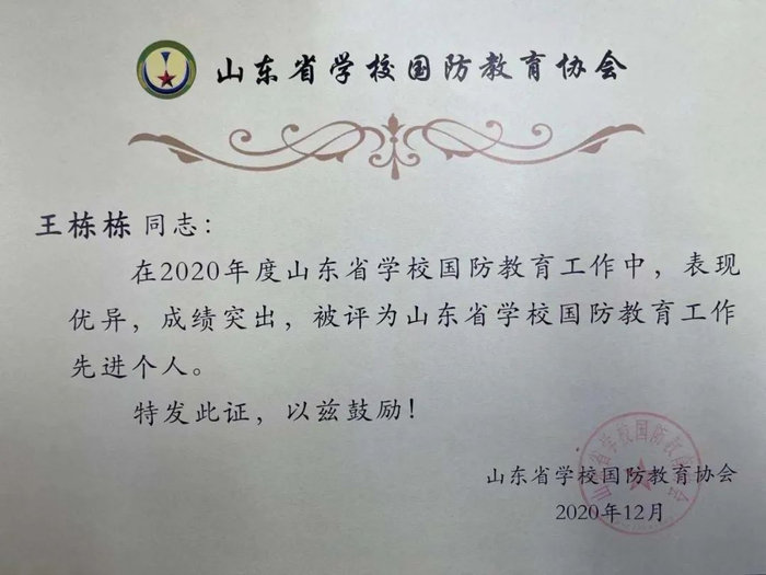 “山东省学校国防教育工作先进个人”