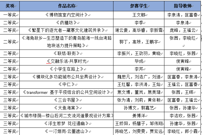 由山东省科学技术协会、山东省教育厅、共青团山东省委、山东省发展和改革委员会、山东省工业和信息化厅、山东省人力资源和社会保障厅联合举办的首届山东省大学生环境艺术创新创意设计大赛成功举行。经过紧张激烈的角逐和严格的专家评审,我校艺术与设计学院环境设计专业学子在大赛中获得优异成绩,共获得省级一等奖1项,二等奖6项,三等奖8项,获奖数量和质量位居山东省高校前列。