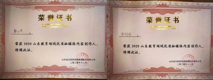 12月25日,由山东省互联网传媒集团主办的2020山东教育品牌建设与传播管理研讨会在济南召开。我校荣获“2020山东最佳社会声誉高校”(本科院校-精进奖)和“2020山东最具影响力教育政务融媒体”(本科高校)。韩小燕、任衍珍获评“2020山东教育领域优质融媒体内容创作人”称号。