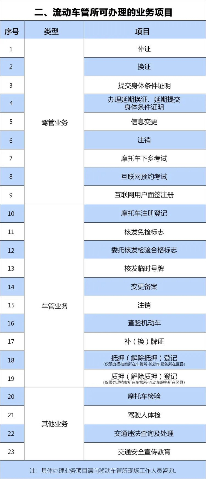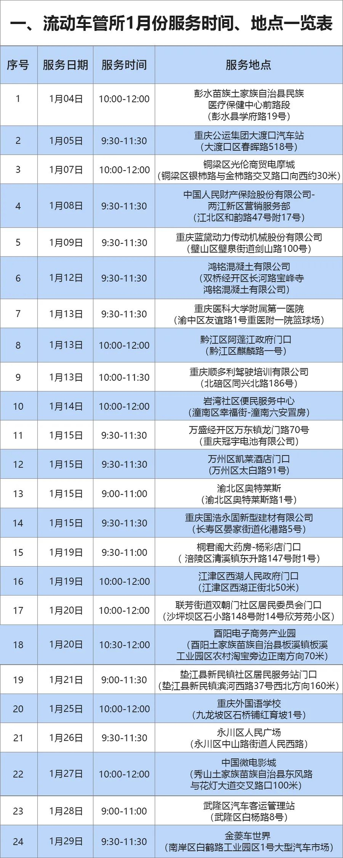 为方便车主和广大驾驶员办理补(换)证、变更备案、抵押(解除)登记、摩托车检验等车驾管相关业务,交巡警总队将在2021年1月份组织流动车管所上门服务24场,请市民根据业务办理需求,查看服务时间,按时前往办理相关业务。(资讯来源:重庆交巡警)