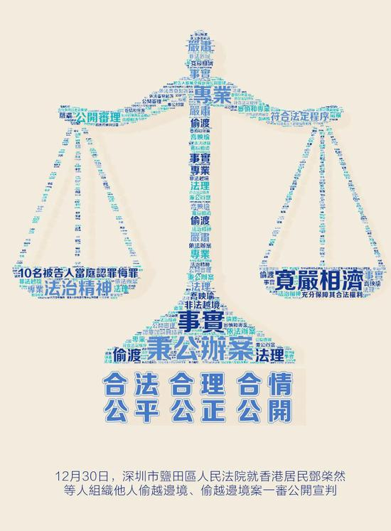 12月30日,深圳市盐田区人民法院就香港居民邓棨然等人组织他人偷越边境、偷越边境案一审公开宣判。10名被告人当庭表示认罪悔罪。此案的侦办和审理,充分彰显了内地法律的规范、严肃,体现了内地司法的公正、专业。