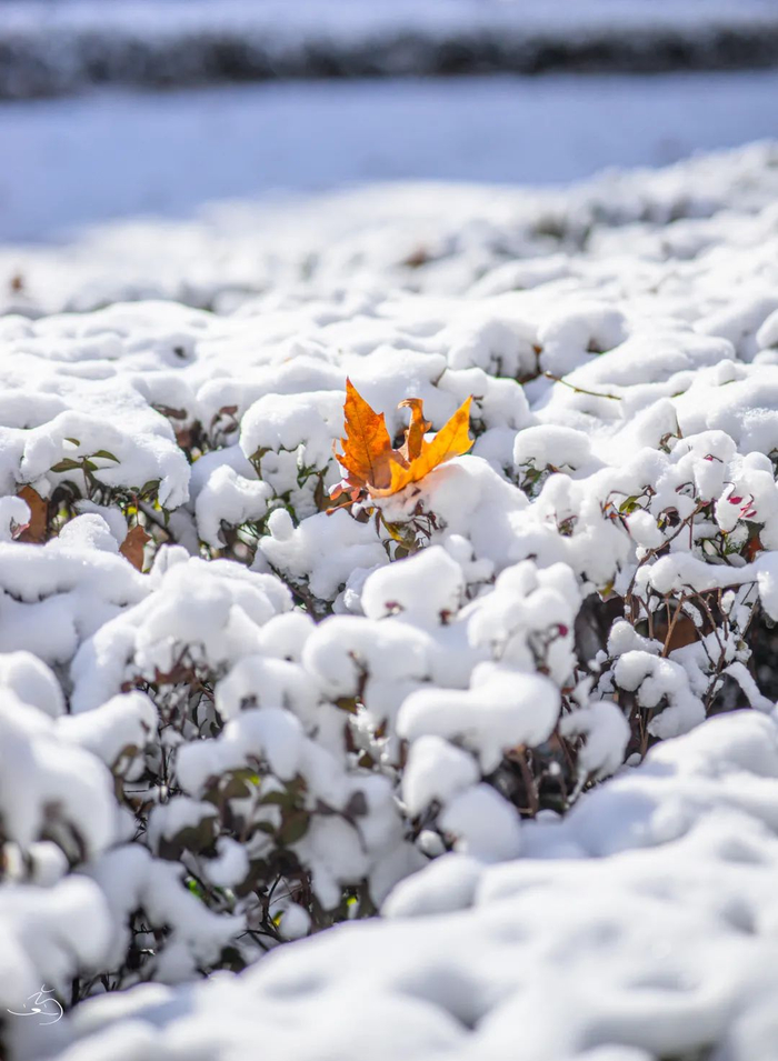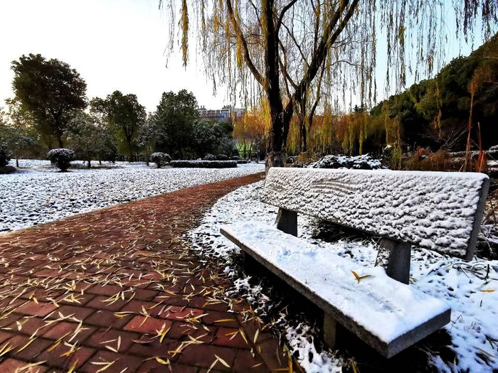 南方的轻雪,点点滴滴的飘落中都带着诗意白色的,如绒花般的,飘落在枝头点缀着青中泛黄的树叶随着风,彰显着晶莹