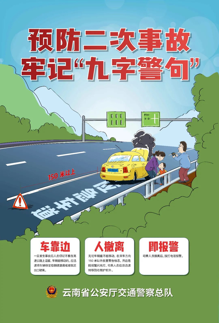 12.牢记高速公路“九字警句”(车靠边、人撤离、即报警)。一旦发生事故后人员切记不要在高速公路上逗留,未造成人员伤亡的轻微交通事故,当事人在确保安全的原则下,拍照取证并记录事故现场相关信息,车辆能移动的,应迅速将车辆移至右侧硬路肩或驶离高速公路;涉及人员伤亡的,要立即报警,马上开启危险报警闪光灯,并在车后150米处设置三角警示牌,车内人员迅速转移到护栏外等候,确保自身安全。