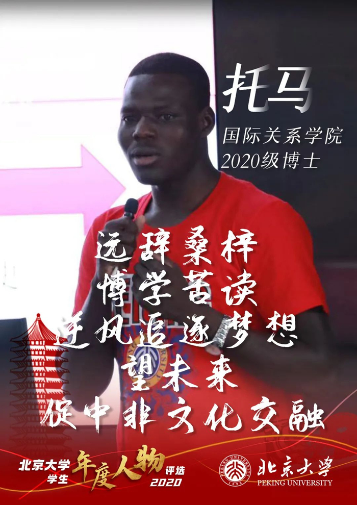 疫情期间,他在校内隔离的近八个月里始终保持乐观、积极心态,积极宣传中国疫情防控进展,在学生防疫工作中做出了突出贡献。托马胸怀大志,他希望将来能成为中乍,甚至中非友谊的桥梁和文化使者,为中非人类命运共同体出一份力。