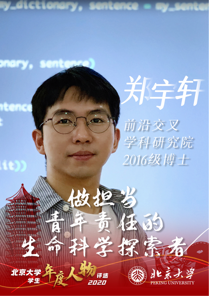 作为青年学者,郑宇轩心系人类健康,潜心探寻生命密码,在生命科学研究前沿向世界发出中国学者的声音;作为青年学生,他勇于担当,参与国家重大赛会活动,焕发新时代青春光彩;作为青年志愿者,他积极投身社会服务,践行志愿服务精神,担当时代青年责任。