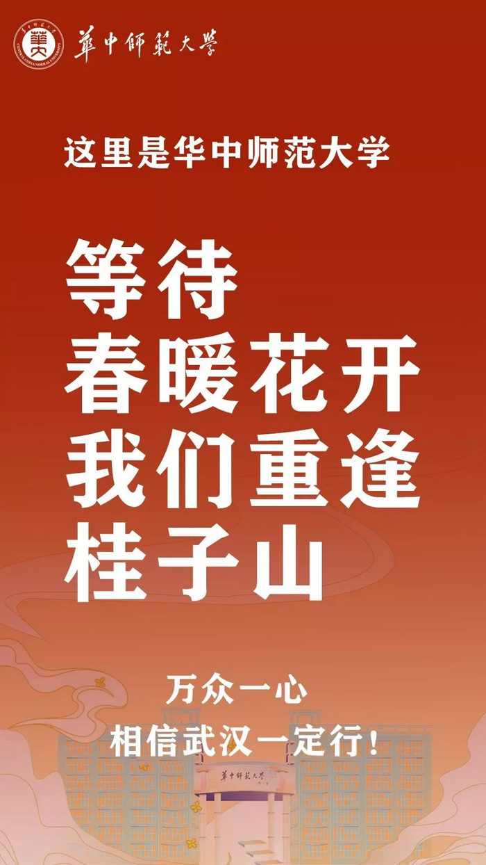1月26日,华师发布关于延迟2020年春季开学时间的通告。那一刻,我不知道何时可以重返校园,但我相信,武汉一定会好起来,一定会的!我们,在祖国各地遥祝平安。