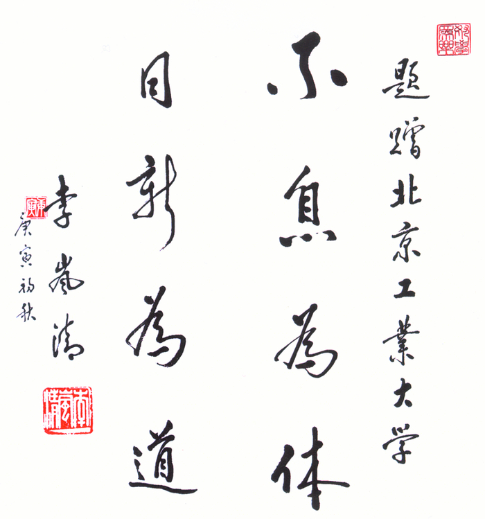 2002年,我为毕业生题词“不息为体,日新为道”,后来还请李岚清和贾庆林等党和国家领导人来题词。这句话取自唐朝诗人刘禹锡的《问大钧赋》中的“以不息为体,以日新为道”,我从中引出来的。后来这个题词成为了学校师生广为传颂的一个工大精神,写入了校训,一直流传到现在。“不息为体”意指北工大人永不停止、永远向前战胜困难,这其实是北工大人的一种状态,也是我们身上最突出的精神;“日新为道”旨在传递一种与时俱进、不断开拓进取的新境界,是能够引领未来的,将北工大建设得越来越好。
